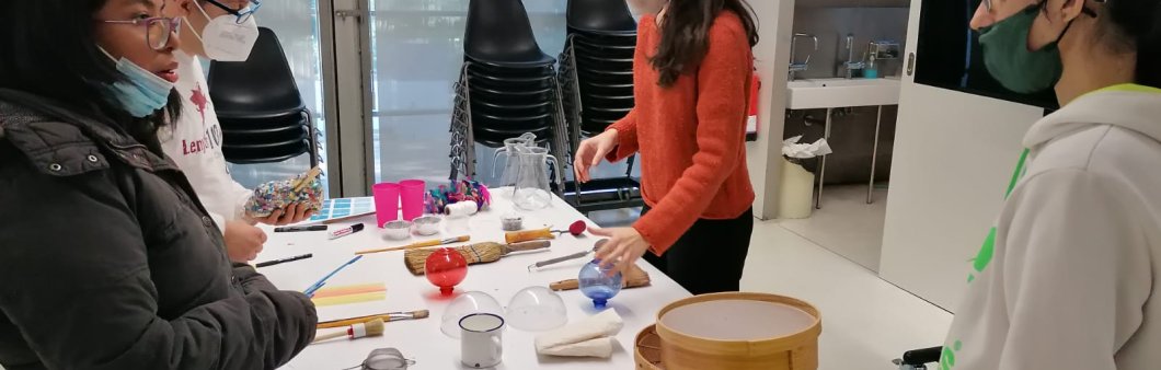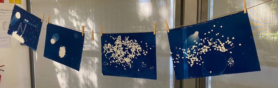 Les línies del dibuix, les matèries, els objectes i els elements naturals es transformen en formes planes de color blau cian. Són imatges fotogràfiques obtingudes quan els rajos solars toquen la superfície d'un paper sensible a la llum. A partir de la tècnica de la cianotípia, el taller estimula l'experimentació i el joc.