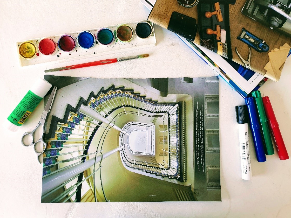 Material: imatge impresa; elements opcionals: tisores, llapis, bolígraf, papers neutres o de colors, llapis de colors, ceres de colors, retoladors, altres imatges impreses, guaix, altres.