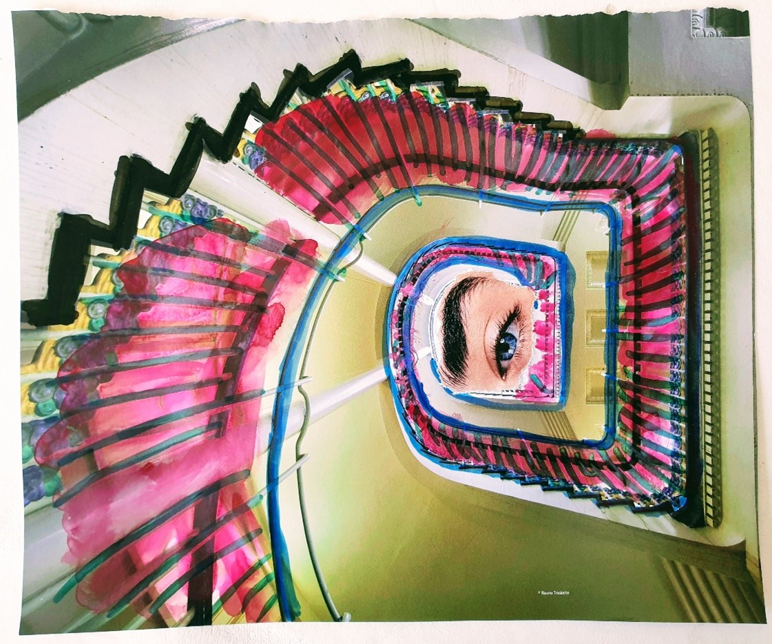 - Una altra possibilitat és dibuixar-hi al damunt i afegir-hi colors. Podem resseguir el contorn d'algun element de la imatge o bé fer una cosa totalment lliure. Si resseguim els contorns, donarem importància a allò que hem redibuixat. Si hi afegim un disseny totalment lliure, es produirà un xoc visual amb la imatge de sota.