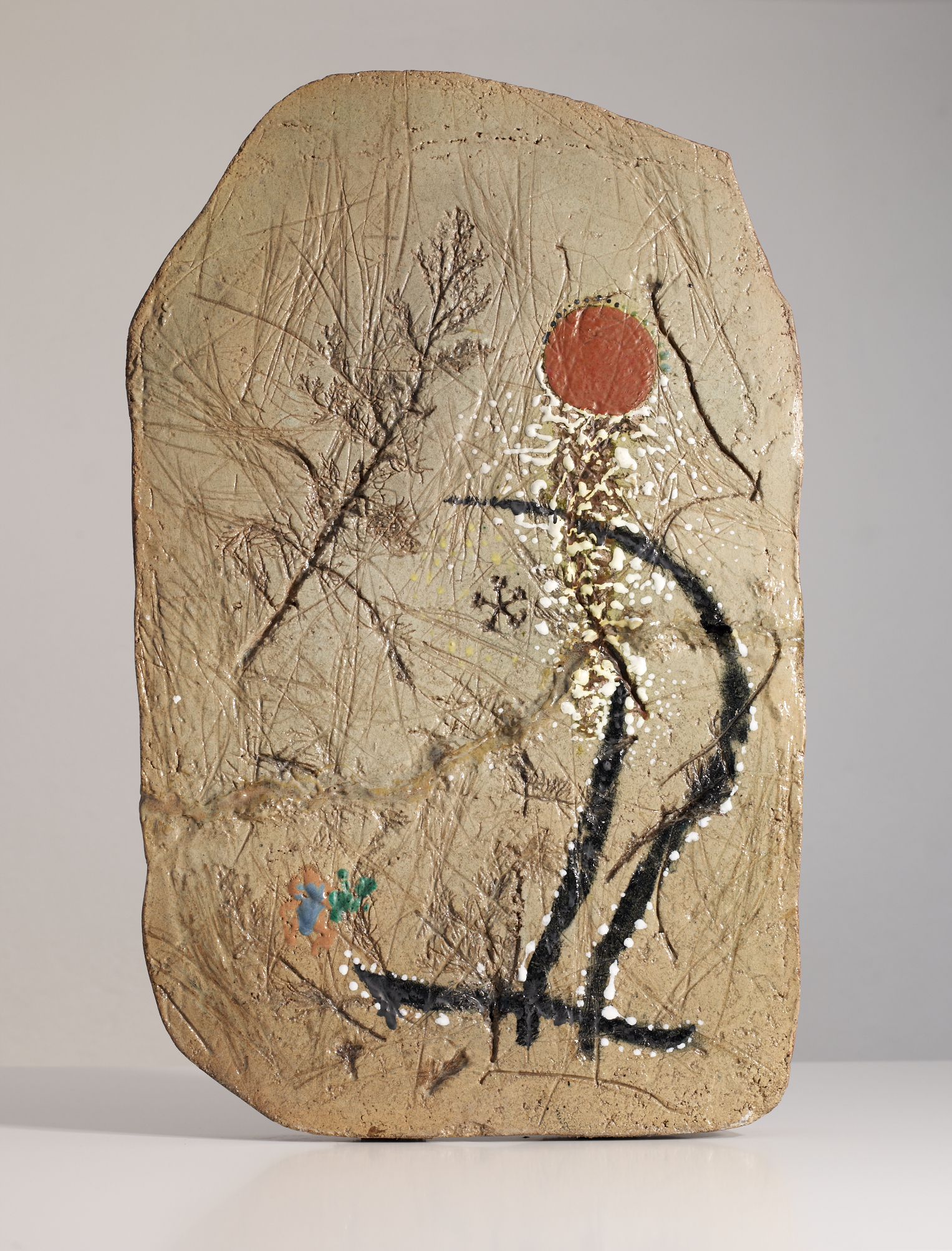 El punt de partida d'aquesta obra és una peça de fang plana més o menys rectangular, de 80 x 50 cm, treballada per ambdues bandes. Si tens per casa un paper d'aquesta mida, te'n podràs fer una idea. En aquesta obra de Miró una cara mostra un disseny ben perfilat amb uns components fàcils d'identificar, mentre que l'altra és més rugosa i abstracta.
