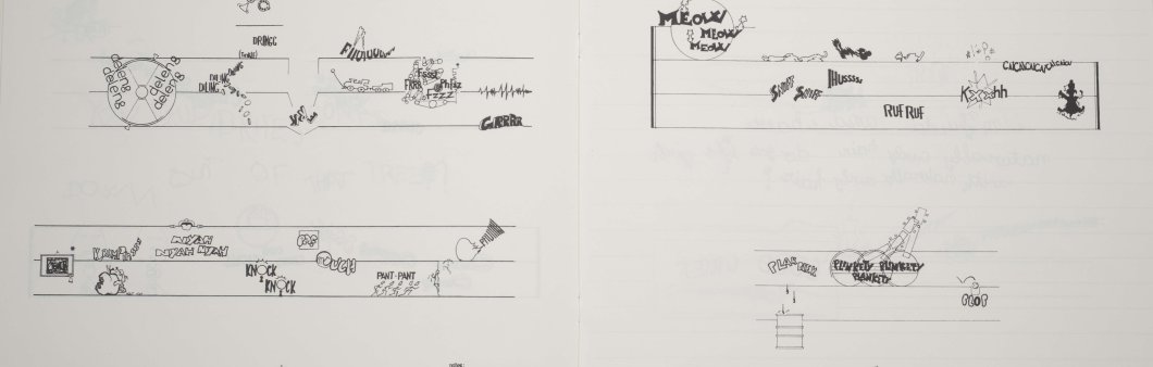 Per a aquest taller proposem una sèrie d'exercicis al voltant d'aquesta idea. Un taller que comença amb una col·lecció d'onomatopeies que interpretarem amb el nostre cos; continua amb exercicis de representació gràfica de sons (una línia recta, una línia ondulada...), i finalitza produint i interpretant una gran partitura gràfica col·lectiva perquè ens puguem inventar els nostres propis sistemes de notació.