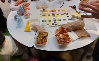 L’artista Inula va aproximar les famílies de l’Escola Octavio Paz als aliments tot experimentant des del color que se n’extreu per tenyir o fer tints, que es van aplicar a papers amb els quals es van teixir unes estovalles.