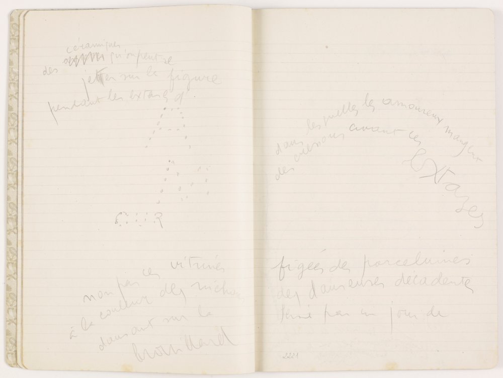 des < assiettes > céramiques qu'on peut se / jet< t >er sur la figure / pendant les extases d'/ A / M / OUR / dans lesquelles les amoureux mangent / des cressons avant ces extases / non pas ces vitrines / figées des porcelaines / à la couleur des nichons / des danseuses décadentes / dansant sur la / Seine / par un jour de / brouillard