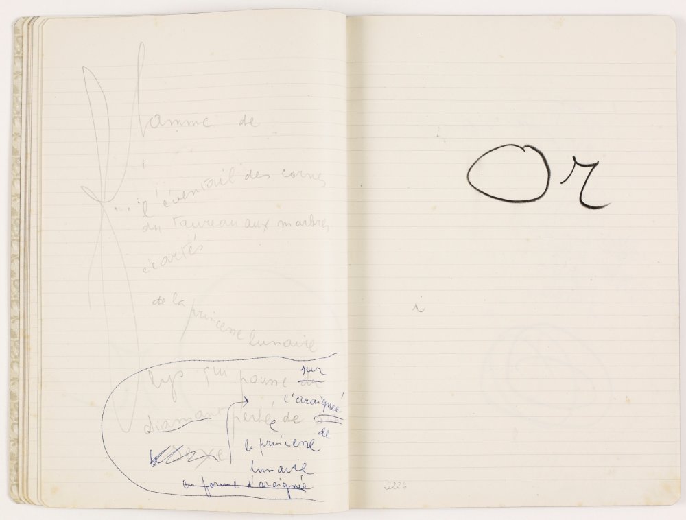 flamme de / l'éventail des cornes / du taureau aux marbres / écartés / de la princesse lunaire / lys qui pousse du / diamant perlé de son / sexe / Or / i // [inscripcions a bolígraf] [lys qui pousse] sur / < en forme d'araignée > / l'araignée [perlé]e de / la princesse / lunaire
