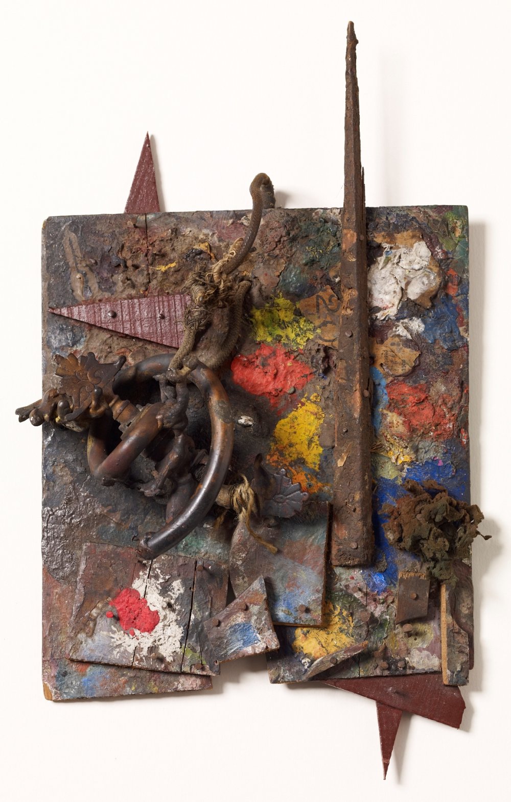 - Construcció. Oli, paper, cordill, esponja i metall damunt fusta (paleta de pintor i falques)