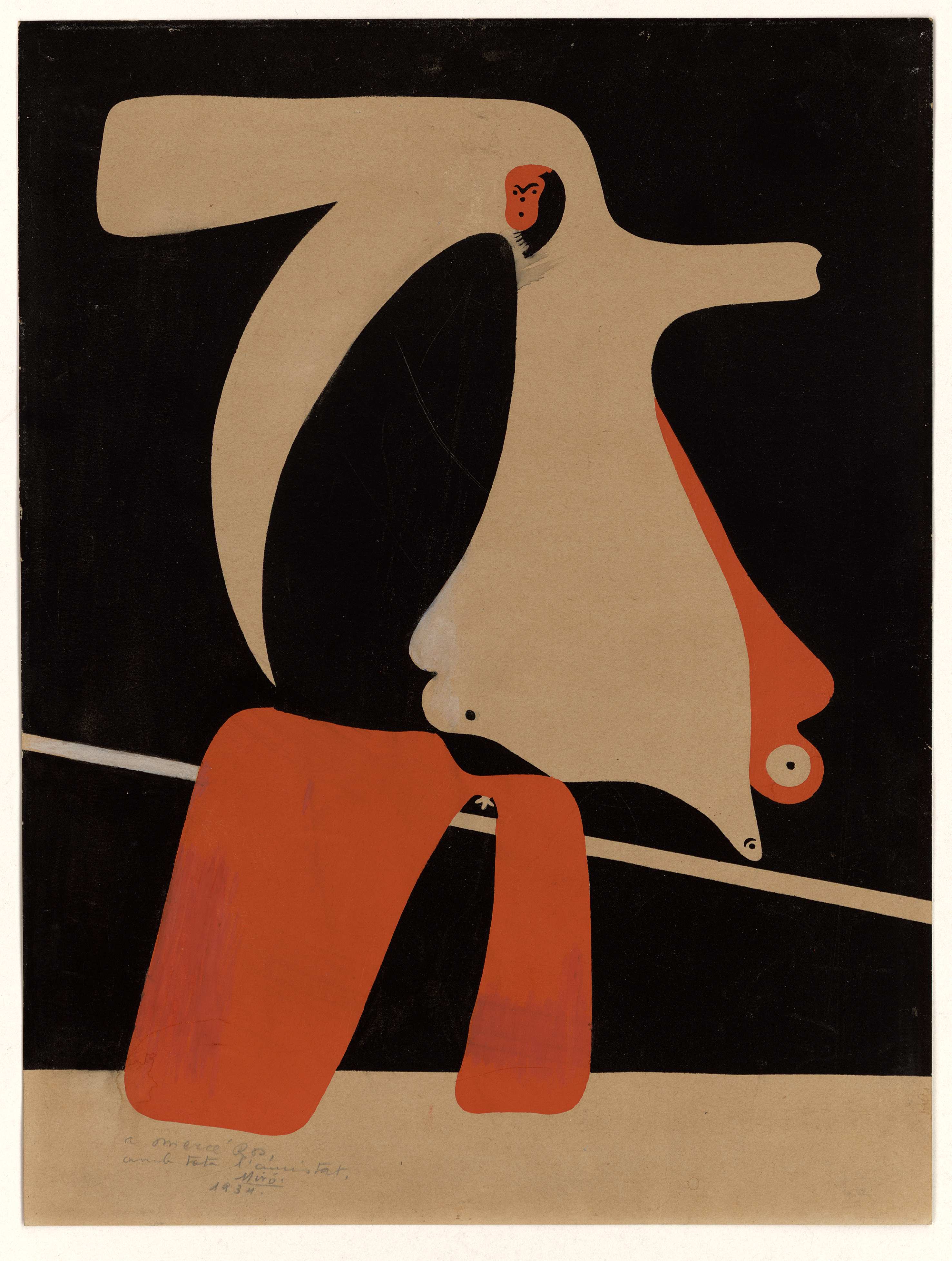 Each shape is the result of laying down a stencil with the cut-out shape on a specific part of the paper. Next, Miró applied colour (black, red, or blue) with a roller, which covered the paper through the cut-out area.