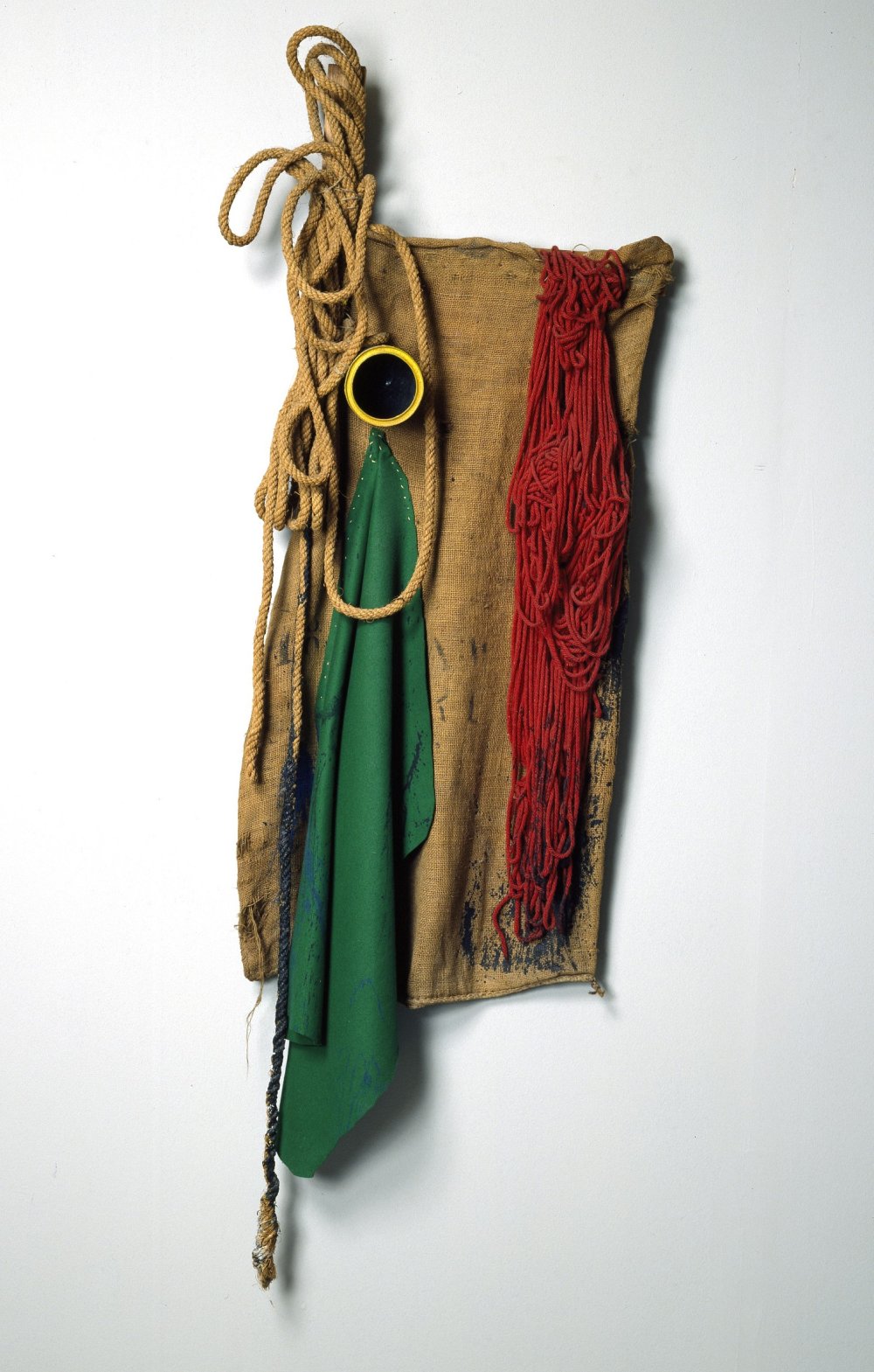 - Acrylic, string, felt, wool and metal can on sackcloth