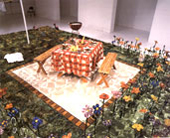 When it was finished she started on The Back Yard, which in many ways represents the way of life in American suburbs with their detached houses. This time, however, she did not work alone but organized workshops where volunteers spent hours and hours helping to give shape to the blades of grass with millions of beads — a task that would have taken a single person about forty years to complete.