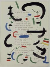 It shows works by Miró produced between 1960 and 1970 and books by Dupin illustrated by Miró, as well as the poet's critical appreciations of Miró's art published in catalogues and reviews. There are also poems illustrated by Miró and a variety of manuscripts, letters, photographs and models for joint collaborations.