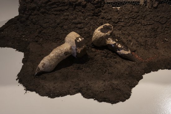 The traditional construction of a bahareque wall in this underground room reactivates its original purpose as a refuge and establishes a temporarily disruptive area in the choreographies of global domination, inviting visitors to Espai 13 to breathe literally under the ground. A video made by Jota Mombaça juxtaposes shots of the inside of the artist's mouth with images of a mining site.