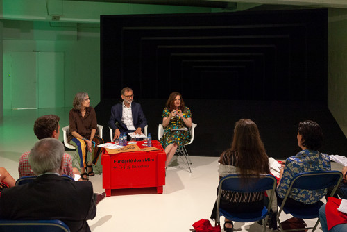 La comisaria del ciclo, Pilar Cruz; el director de la Fundació Joan Miró, Marko Daniel, y la responsable de programas de la Fundació, Martina Millà, han presentado el ciclo de exposiciones de Espai 13 para la temporada 2017-2018, que cuenta con la colaboració de la Fundació Banc Sabadell.