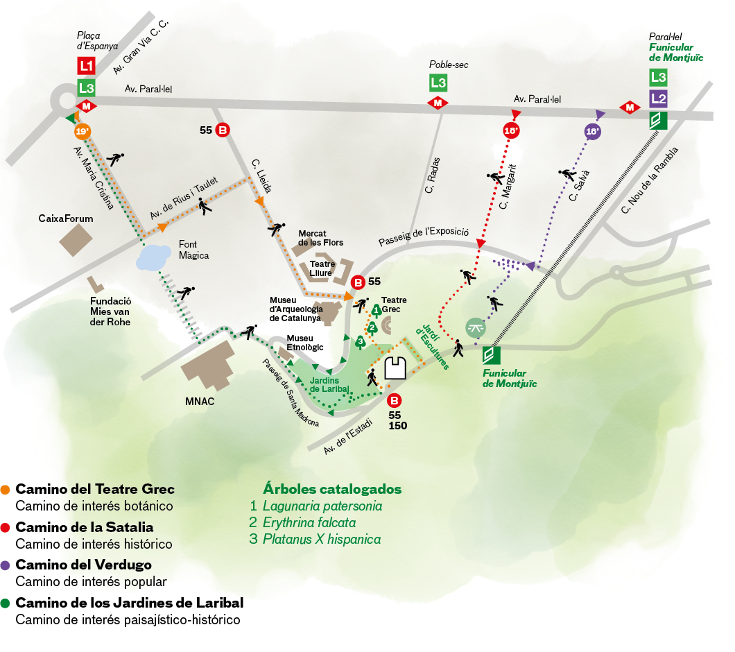 Si te interesa la botánica o la geología, este es tu camino. Aquí podrás contemplar ejemplares interesantes y únicos como la Erythrina falcata, la Lagunaria patersonii o las rosaledas de Banskia, así como la antigua cantera Machinet que cierra el Teatre Grec.
